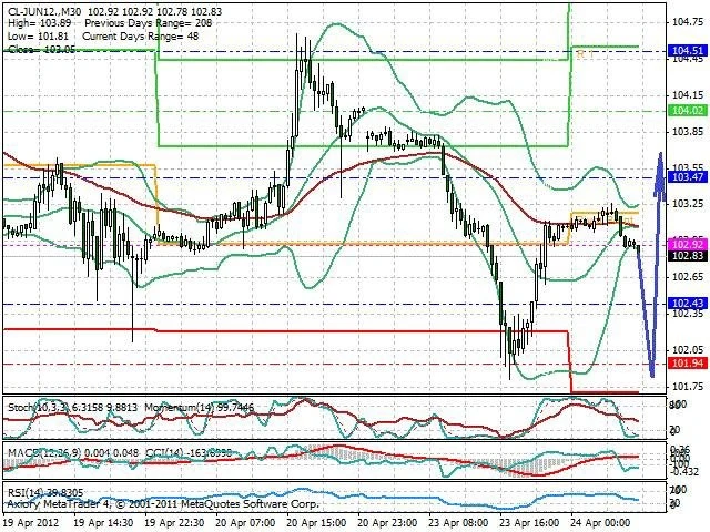 Předpokládaný pohyb pro dnešní den LONG. Případné vstupy do obchodu z hladiny 101.8 s předpokládaným cílem 103.6 případně až 104.45. Proražení hladiny 101.8 může vést k pohybu s pravděpodobným cílem 101.2 až 100.