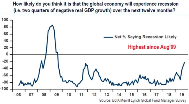 V případě USA, systémově nejvýznamnější ekonomiky, to platí mimo jiné o prodejích nákladních aut, žádostech o dávky v nezaměstnanosti, průmyslové výrobě a v neposlední řadě často diskutované inverzi výnosové křivky. Německo, Británie a další velcí hráči pak již tančí na hraně poklesu ekonomiky, případně za ní. I proto nyní v pravidelném průzkumu Bank of America Merrill Lynch čeká globální recesi nejvíce manažerů fondů od doby finanční krize.