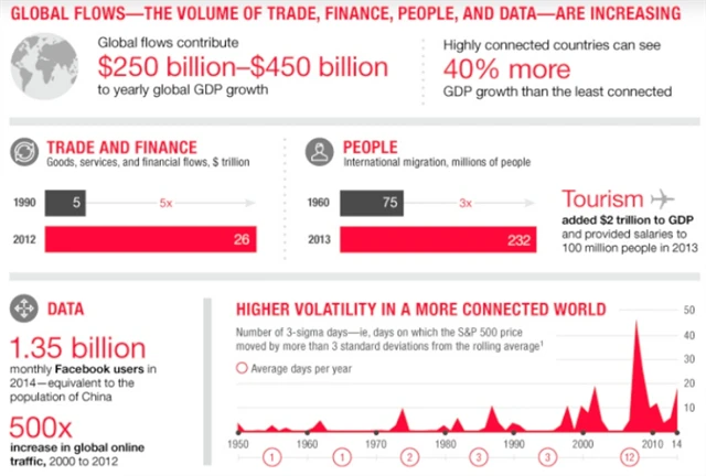 Tam, kam političtí regulátoři nedosáhli stejně snadno, tedy například ve sféře fungování nadnárodních dodavatelských řetězců, ale globalizace na steroidech až donedávna celkem nerušeně pokračovala. Svědčí o tom mnohé ukazatele, mezi něž patří i Global Connectivity Index, podle kterého po krizové paralýze z roku 2012 globalizace v roce 2014 opět nabrala dech.