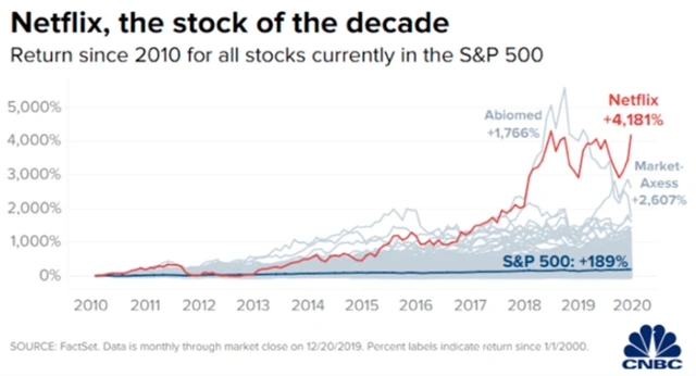 Pro akciové investory se proto premiantem stal Netflix, jenž z dolaru za uplynulou dekádu udělal bezmála 43 dolarů. S výrazným náskokem tak překonal index S&P 500 (+189 %) a drtivou většinu titulů v něm zahrnutých.