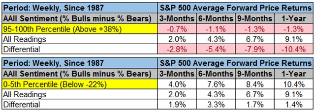 Bilello na základě takto nastavených pásem potvrzuje, že po obdobích optimismu a chamtivosti většinou následuje období poklesu a naopak po obdobích opatrnosti investorů následuje prakticky pokaždé období nadprůměrného růstu. V zásadě tak dává za pravdu i Buffettovi.