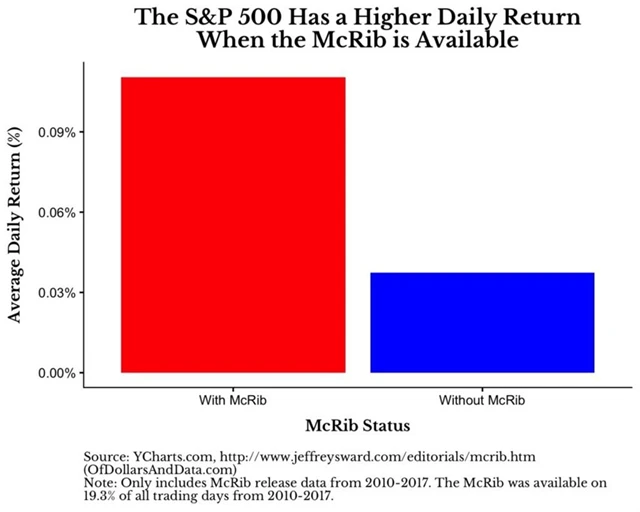 Výsledkem bylo zjištění, že v 4,6 % případů průměrné denní zhodnocení akcií McDonald's bylo o sedm a více bazických bodů vyšší v době nabídky sendviče McRib, ale současně bylo v 4,2 % případů v době nabídky McRib o sedm a více bazických bodů nižší.
