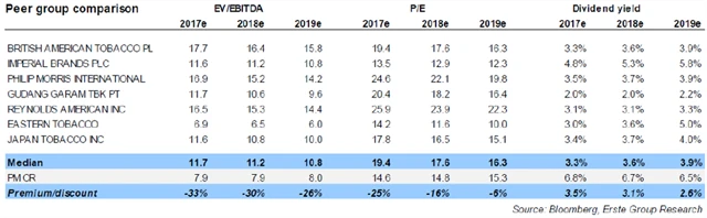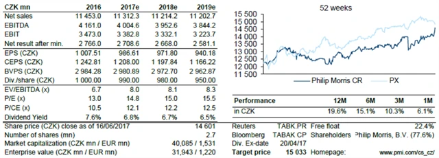 V odhadech počítáme se stabilním tržním podílem Philip Morris ČR na českém i slovenském trhu. V České republice očekáváme, že díky růstu mezd bude posilovat prémiový segment. Nárůst podílu na trhu byl vidět již v roce 2016 a očekáváme, že tento trend bude bez větších přerušení pokračovat i v dalších letech. Nárůst průměrné ceny je v našich odhadech jedním z hlavních důvodů, proč by měla dividenda v roce 2017 poklesnout jen mírně.
