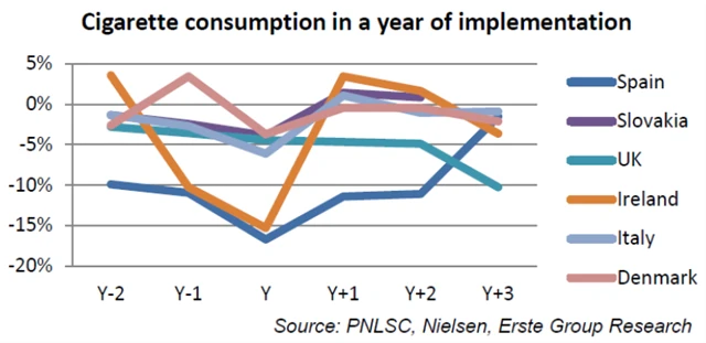 Na základě analýzy dopadů zákazu kouření z jiných zemí očekáváme 4% pokles spotřeby v České republice v roce 2017 a 3% pokles v roce 2018. Srovnání je ale problematické, jelikož každá země je unikátní. Některé státy (například Belgie) zaváděly zákaz kouření postupně. V jiných (Nizozemsko) byl zákaz doprovázen výrazným zvýšením zdanění tabákových výrobků.