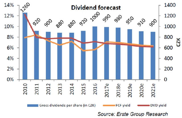 Očekáváme ale i tak mírný meziroční pokles dividendy v roce 2017. Vysoký dividendový výnos by měl být udržitelný i díky lepší provozní efektivitě a silné rozvaze. Společnost disponuje silným přebytkem hotovosti, která je potenciálně k dispozici pro výplatu akcionářům. Využití tohoto přebytku by mohlo vyrovnat odhadovaný mírný pokles zisku mezi lety 2017 a 2021.