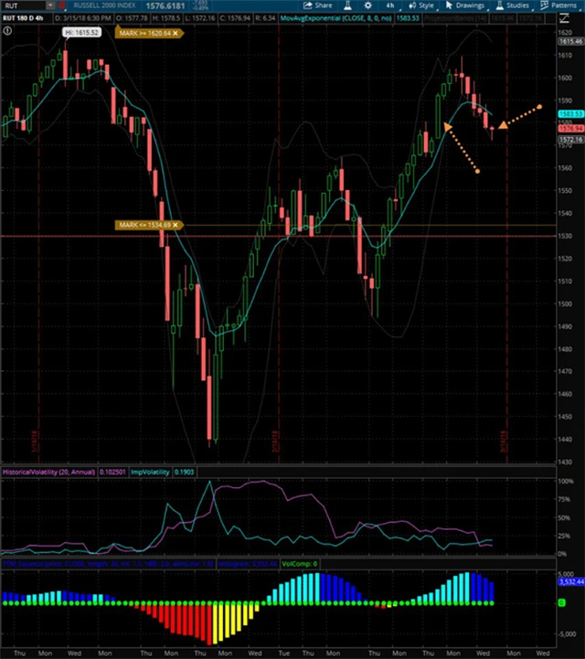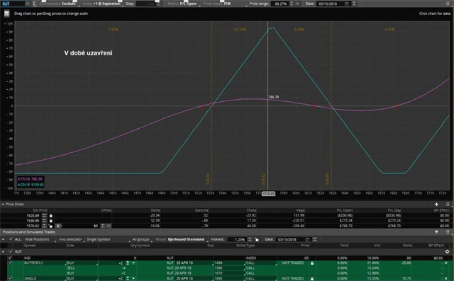 Strategie butterfly u indexu Russell 2000 (RUT). Vstup 9. března za 39,35 USD, výstup 15. března za 44,30 USD. Čistý zisk na jeden kontrakt (po odečtení hedgeové pozice) 430 USD za 5 dnů.
