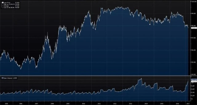 Na grafu je eurodolarový futures kontrakt s expirací za dva roky. Trh již zvyšování sazeb v USA zčásti započítal, ale jen zčásti, tedy na sazbu 2,19 % (cena 97,81). Nyní je 3M LIBOR 1,1 % s prostorem pro růst.
