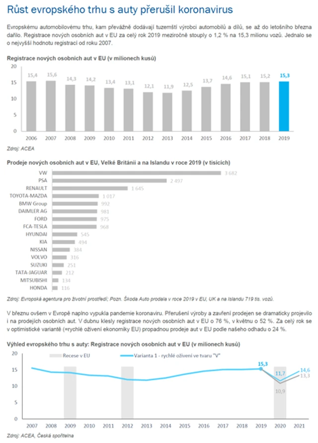 Růst evropského trhy s automobily přerušila jarní pandemie koronaviru. V dubnu klesly registrace nových osobních aut v Evropské unii o 76 %, v květnu pak o 52 %. Vedle obnovení výroby a snahy o nastartování prodejů ale čeká automobilky také boj o splnění limitů emisí skleníkových plynů.