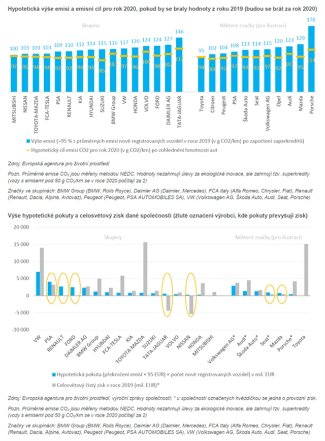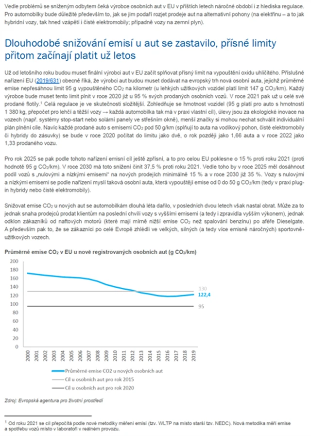 - V letošním roce musí automobilky dodávající do EU v průměru snížit emise CO2 na 1 auto o 15 % proti roku 2019 (například Škoda Auto o 16,9 %, Hyundai o 17,4 %).