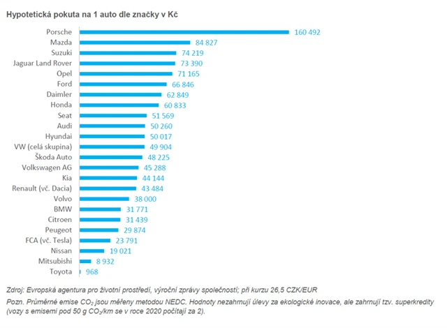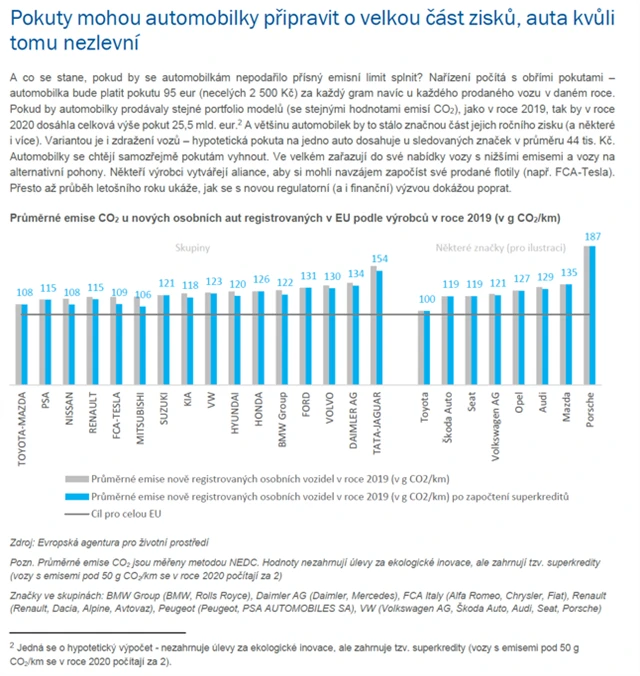 - Pokud se jim to nepodaří, budou následovat obří pokuty. V případě, že by automobilky prodávaly stejné portfolio modelů (se stejnými emisemi CO2) jako v roce 2019, celková výše hypotetických pokut by dosáhla 25,5 miliardy eur.