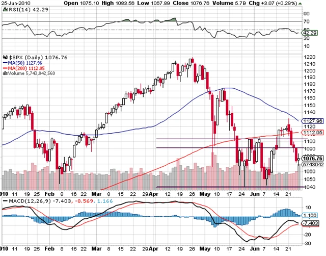 Rychlý růst indexu S&P 500 začal ve druhém týdnu v červnu, kdy se cena odrazila od suportu na hladině 1 040 a během deseti obchodních dní se dostala intradenně až na hodnotu 1 130 bodů. Jestliže však budeme uvažovat jenom zavírací ceny, růst byl "jen" o 55 bodů. (27. 6. 2010)