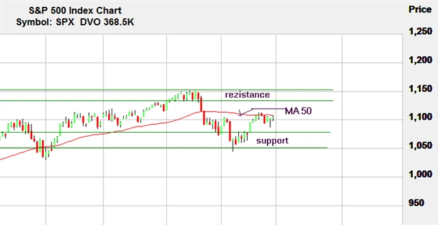 Tato cena byla v minulosti už několikrát protnuta, proto není tak významná. Dostáváme se tak k rezistenci (hladině odporu) na cenách 1 130 až 1 150 a supportu (hladině podpory) na úrovních 1 060 až 1 080. Obě úrovně jsou dost silné a nějakou dobu může index zůstat mezi nimi.
