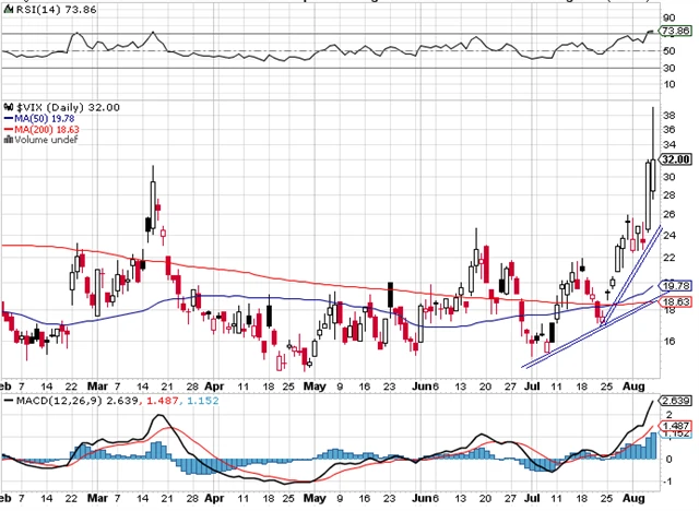 Index volatility VIX se při pondělním výprodeji vyšplhal až na hodnotu 48, kde byl naposledy 21.5.2010. Další dny dosahoval nižších hodnot a v pátek uzavřel na 36,6. Jestliže pondělní maximum bylo vrcholem, je to pro akciový trh pozitivní signál a k panickým výprodejům by nemělo docházet.