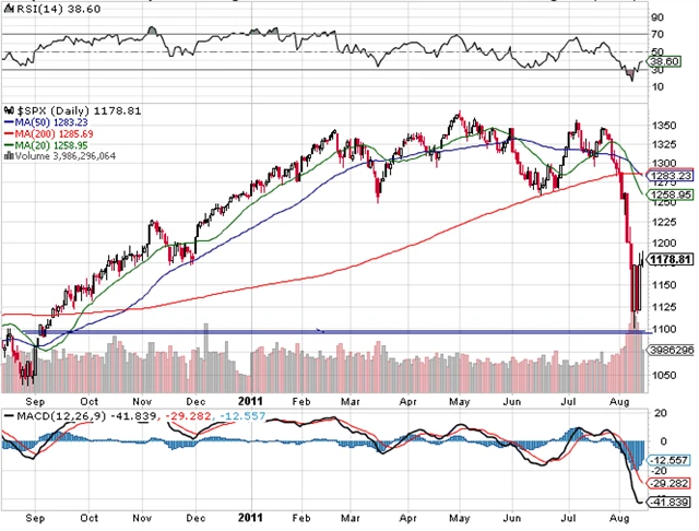 Pokles, který jsme zažili, byl jedním z nejrychlejších v historii a začal, když byla situace na trzích poměrně klidná a technické indikátory ukazovaly na možnost dalšího růstu. Výprodeje za poslední dva týdny lze asi nazvat pouze slovem panika. V pondělí, po snížení ratingu Spojených států, došlo k očekávanému poklesu, který byl 83 bodů, tedy téměř 7 %, a index uzavřel na ceně 1119,50.