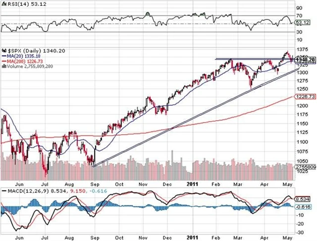 V pondělí otevřel trh po zprávě o zabití bin Ládina výše. Intradenně se cena dostala na 1 370, potom však rychle nastal obrat. Ve čtvrtek vstoupila do hry negativní zpráva z trhu práce. Dolar po zprávě od ECB o zvýšení úrokové sazby rostl a přispěl k propadům cen komodit. Index S&P 500 se dostal na kritickou hladinu v oblasti 1 330 – 1 340. Ve čtvrtek prorazil rostoucí 20denní klouzavý průměr.
