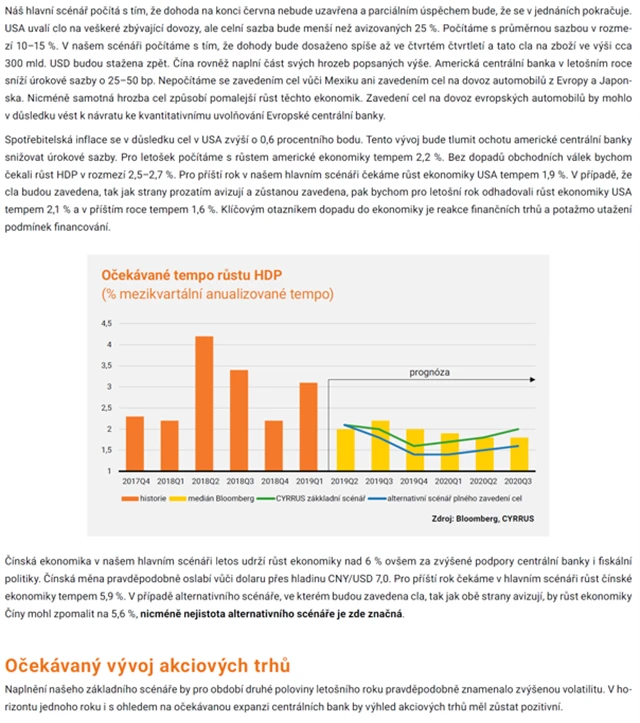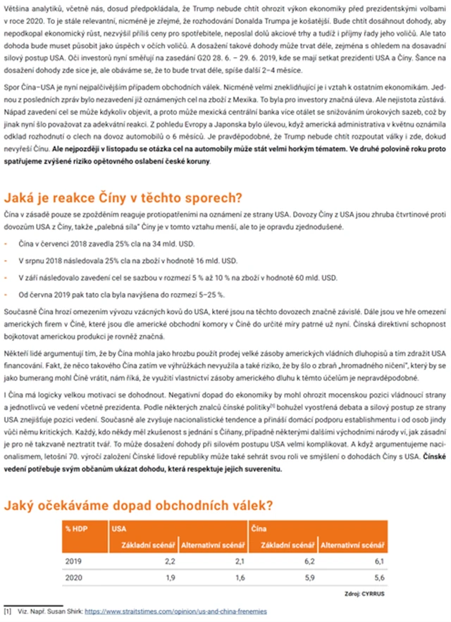 Prezidenti USA a Číny se mají sejít na konci června v Japonsku na zasedání G20. Rychlé uhašení sporů je nepravděpodobné, zlepšení čekáme až ve čtvrtém čtvrtletí 2019, píší analytici ze společnosti CYRRUS. Obchodní spory podle nich dopadnou na růst ekonomik, na což budou reagovat centrální banky.