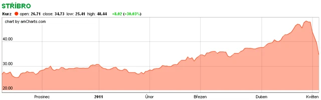 Stříbrní býci shodili rohy a obouvají si medvědí papuče. Stříbro v posledních několika dnech ztratilo 15 dolarů ze své ceny, která se dotkla rekordních úrovní okolo 50 dolarů. Během dnešního dopoledne se drží zhruba na včerejších 34,6 dolaru. Investoři, kteří se ke "stříbrnému stádu" připojili někde nad 20, 25 dolary, stále vydělávají. Ekonomická nejistota ovšem roste, a tak si mnozí zkrátka řekli dost a své pozice s pohádkovým ziskem vyprodali. Spekulace se také kvůli zdražení obchodování se stříbrem na burze COMEX vyplatí o dost méně. Kde najde stříbro novou hladinu podpory?
