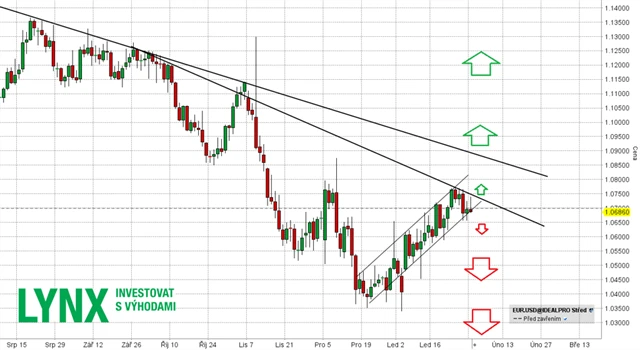 Pro pokračování výše bychom potřebovali vidět výstup nad aktuální klesající linii. O obratu většího trendu bychom uvažovali, pokud by se cena dostala nad úroveň před americkými prezidentskými volbami. Cenové úrovně tehdy velice jednoznačně ukázaly, co si měnový trh myslí o budoucím vývoji. Potenciálně negativní zprávy pro dolar (růst EUR/USD) byly ihned koupeny a pár se naopak propadl níže. Výstup nad tyto úrovně by značil, že trh změnil názor.