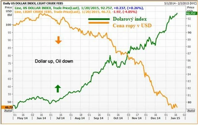 Ceny ropy se na světových trzích vyjadřují v dolarech. Když tedy dolar posiluje, ropa zlevňuje. Ano, je pravda, že producenti ropy dodávají na trh více suroviny, než se stačí spotřebovat, díky americké těžbě z břidlic a neochotě kartelu OPEC snížit produkci. Jenže přebytek produkce je nižší, než byl třeba v roce 2012. Mezi roky 2012 a 2013 přitom cena ropy neklesla tak rychle a tak výrazně jako za poslední půlrok.