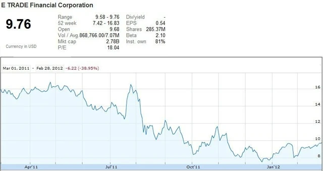 Loňský propad v ceně akcií byl v případě E*Trade Financial (ETFC) 50 %. Firma je samozřejmě hlavně on-line brokerem, ale patří k ní také banka s 45,8 miliony USD v celkových aktivech (k 30. 12. 2011). Společnost oznámila za čtvrté čtvrtletí čistou ztrátu 2 centy na akcii ve srovnání s 11 centy na akcii před rokem. Ztráty z úvěrů se ve čtvrtém čtvrtletí meziročně snížily. Management se nyní zaměřuje na ozdravení rozvahy, zlepšení poměru kapitálové přiměřenosti, redukci nákladů a růstové investice. Růstový potenciál ETFC je dlouhodobě výrazný, krátkodobě se však společnost bude muset vyrovnat s přetrvávajícími nepříznivými makroekonomickými a regulatorními podmínkami.