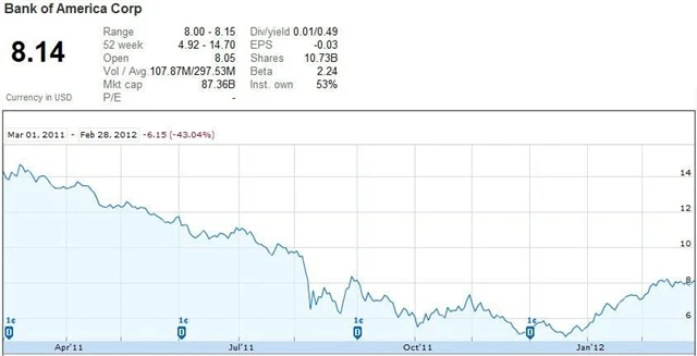 Akcie Bank of America loni ztratily 58 % a analytici jsou ohledně této banky nadále poměrně skeptičtí. Vidí u ní sice růstový potenciál, ale bude podle nich trvat delší dobu, než se jí podaří v prostředí nízkých úrokových sazeb obnovit EPS a omezit výdaje spojené s problémovými hypotékami.