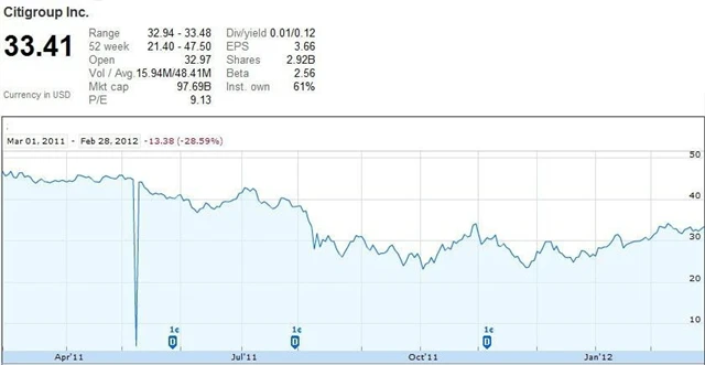 Akcie Citigroup loni zaznamenaly pokles o 44 %. Management slibuje, že dlouhodobě vylepší návratnost kapitálu díky zvyšování dividend a zpětným odkupům, a navíc by měla být podpořena i 40 miliardami v DTA (defferred tax assets), která nejsou zahrnuta do Tier 1. Navzdory slušné výkonnosti od začátku roku vidí analytici u Citigroup nadále velký potenciál růstu. Oproti BoA je riziko spojené s problémovými hypotékami u Citigroup nižší, přesto nedávno proběhlo médii, že bude banka možná nucena k velkým odpisům v souvislosti s joint venture Morgan Stanley Smith Barney.