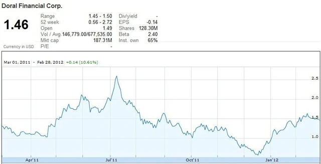 Akcie portorické Doral Financial loni přišly o 31 % hodnoty. Zisk ve čtvrtém čtvrtetí 2011 vzrostl na 49,4 milionu z loňských 47,6 milionu USD. Za růstem stojí zejména snížené náklady na financování. Banka také navýšila úrokové marže díky snížení sazeb na retailová depozita. Výrazný pokles zaznamenaly i ztráty z hypoték. Doral Financial bez problému splňuje kapitálové požadavky s poměrem Tier 1 k rizikovým aktivům 9,13 % a celkově 13,43 %. Očekává se, že výsledek by mohly zlepšit ještě dodatečné daňové benefity.
