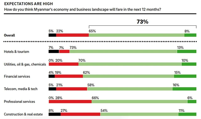 To ostatně potvrzuje i čerstvá studie konzultantů ze společnosti Roland Berger nazvaná Vlna optimismu: Vydrží?, podle které dvě třetiny byznysmenů znalých prostředí Barmě stále věří. Mezi tahouny mají patřit turistický ruch, chemický průmysl a aktivity související s ropou a plynem, nad stavebnictvím a realitami je naopak přechodně oblačno až zataženo. I tak má například podle britského velvyslance v Barmě Andewa Patricka velkou šanci stát se příštím Thajskem či Vietnamem, tedy dosáhnout až 10% ročního růstu.