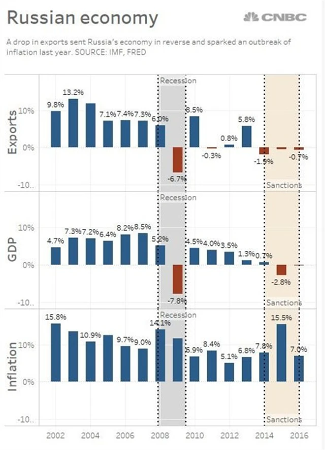 Otázka za miliardy zní: Byla největší země světa již na skutečném dně, nebo ne? Pro temnější ze dvou scénářů hovoří mimo jiné rozhodnutí amerického Kongresu zpřísnit kvůli vměšování do loňských prezidentských voleb sankce, které USA uvalily na Rusko po anexi Krymu. Společně s propadem cen ropy (ke kterému podle některých teorií také přispěla snaha západu zatlačit na Moskvu) sankce zapříčinily kolaps ruského rublu, vysokou inflaci, úprk kapitálu ze země a ve výsledku dýchavičnost ekonomiky.