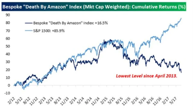 Skupina 54 akcií v indexu, který Bespoke Investment Group nazvala lakonicky Death by Amazon, od začátku roku ztrácela 20 % a byla na nejnižší úrovni od dubna 2013.