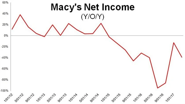 A když hledáme dobrý příklad, nelze si snad vybrat jinou společnost než Macy's. Čistý zisk firmy klesá již deset kvartálů v řadě a za uplynulé dva roky zisk na akcii spadl o 56 %.