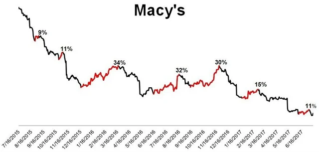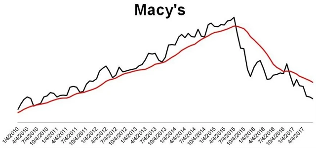 Cena akcií Macy's za 24 měsíců klesla o 71 % (to snad ani nepotřebuje kontext, ale pro ilustraci – celý americký akciový trh do takové hlubiny spadl pouze během Velké deprese).