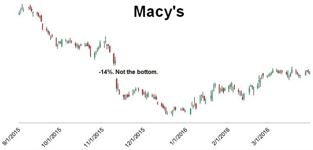 Když nějaký velký brand, kterým Macy's bezpochyby je, zažije takový kolaps, není divu, že se najde hodně investorů chtivých naskočit do pozic za atraktivní cenu. Zaprvé proto, že přece firma jako Macy's po odepsání poloviny hodnoty za 86 dnů od července do listopadu 2015 musí nastoupit cestu vzhůru. Chyba lávky, od té doby titul klesl o dalších 45 %. No a zadruhé to investoři zkoušejí proto, že zkrátka není nic lepšího, než když se vám podaří vydělat na něčem, na čem to ostatní nedokázali. A tím se dostáváme k prvnímu pravidlu či doporučení v oblasti snahy o trefení tržního dna.