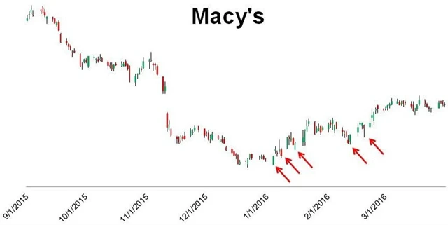 1. Nesnažte se trefit tržní dno. Jde o jednu z nejtěžších věcí v investování. Akcie Macy's během svého 70% sestupu zažily tři rally o 30 %, žádná ale neměla dlouhého trvání. Rychlí tradeři mohli vydělat, lovci nízkých cen z řad investorů odcházeli s prázdnou.