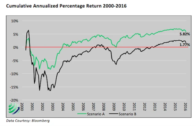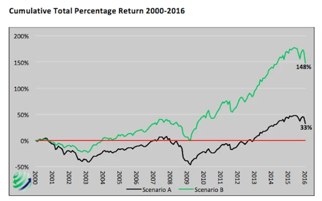 Scénář A počítá s portfoliem, v němž jsou pouze akcie a jež investor nemění za žádných okolností. Scénář B počítá také s portfoliem plně akciovým, ze kterého ovšem bylo během medvědích trendů na začátku tisíciletí (od začátku roku 2000 do konce března 2002) a v roce 2008 (od října 2007 do konce dubna 2009) přesunuto 50 % prostředků do hotovosti. Po skončení medvědího trhu byly peníze alokovány zpět do akcií.
