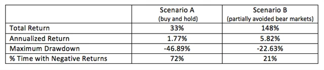 Je patrné, že strategie omezující ztráty je úspěšnější. Údaje v tabulce, zejména ty, které se týkají maximálních ztrát a času stráveného ve ztrátě, jsou možná ještě důležitější. Trefit se do začátku i konce medvědího trendu je samozřejmě prakticky nemožné, ale jde především o to si uvědomit, jak důležité je minimalizovat ztráty. Při držení akcií v celém období se investor dostal do zajímavého zisku až po 13 letech, což může být pro mnoho lidí neúnosná doba.
