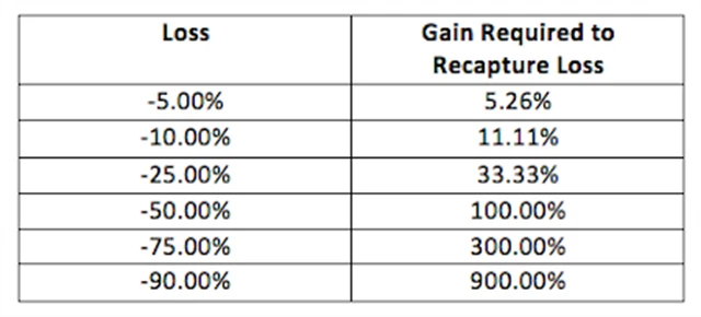 Na první pohled je rozdíl možná velký, ale je potřeba si uvědomit, že prvotní ztráta o určité procento a následný zisk o stejné procento nevedou k nule, ale k celkové ztrátě. Při nižších ztrátách možná rozdíl není tak výrazný, ale čím hlubší je ztráta na začátku, tím déle musí investor vydělávat na to, aby byl vůbec "na svém".
