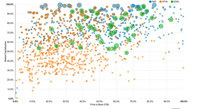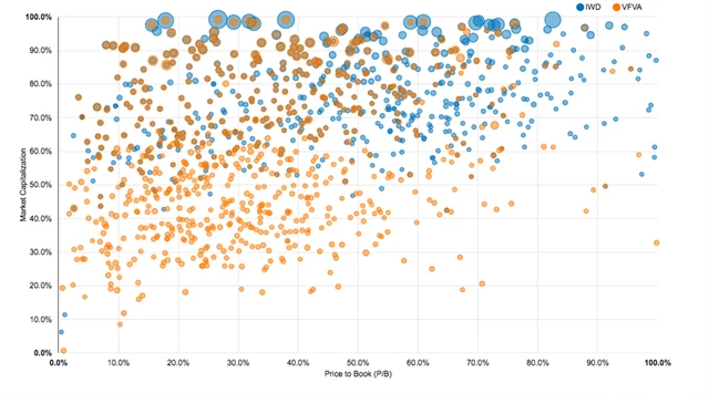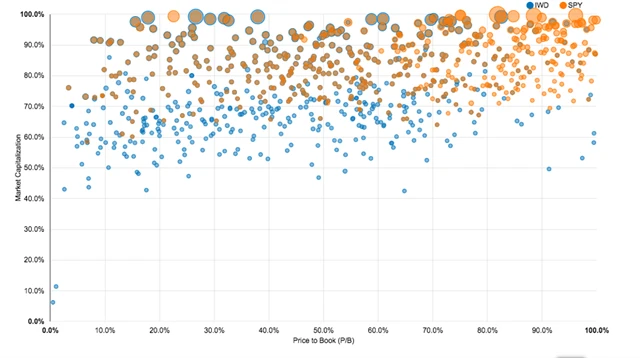 Nick Maggiulli z webu Of Dollars and Data se na téma zaměřil celkem důkladně. Nejdříve porovnal složení indexu S&P 500 (SPY) a iShares Russell 1000 Value Index (IWD) z hlediska velikosti (tržní kapitalizace) a ocenění na základě poměru tržní ceny k účetní hodnotě (price to book ratio, P/B).