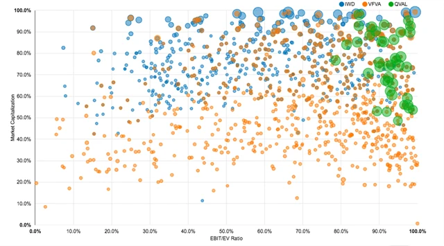 Tento ETF drží pouze 41 titulů, což je zlomek oproti ETF od Vanguardu (783), a na první pohled nevypadá jako příliš hodnotově zaměřený. Když se ale vezme v potaz jiný ukazatel hodnoty, v tomto případě poměr EBIT/EV (poměr zisku před úroky a zdaněním k enterprise value, tedy celkové hodnotě firmy), je jasno.