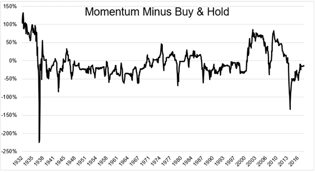 Další graf znázorňuje, jak se dařilo momentové strategii překonávat index. Když je linie nad nulou, strategie překonává v pětiletém horizontu index, když je pod ní, index je na tom lépe. Ano, index byl na tom lépe po většinu času, ale za nižší propady je potřeba obětovat část výnosů.