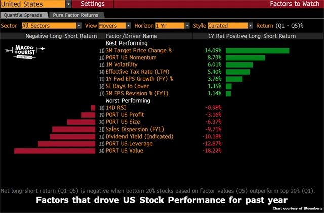 Faktorové investování může fungovat jako alternativa k jednoduchému indexování, protože nabízí možnost překonat trh a dosáhnout nadvýnosu. Vybrat si však tu správnou strategii může být mnohem těžší úkol, než se zdá, protože je jich k dispozici obrovské množství. Kevin Muir ze společnosti East West Investment Management se podíval na ty faktorové strategie, které podle Bloombergu za poslední rok nejvíce ovlivňovaly americký akciový trh. A nestačil se divit.