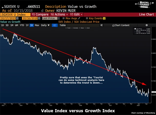 Dále Muir porovnal hodnotové a růstové akcie. V posledních pěti letech na tom byly hodnotové tituly v porovnání s růstovými velice špatně.