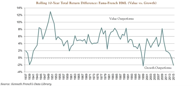 Podle grafu níže se může zdát, že je hodnotový přístup dlouhodobě mnohem výhodnější než ten růstový. 10leté klouzavé výnosy hodnotových a růstových titulů od roku 1930 ukazují, že v 90 % případů hodnotové akcie překonávají ty růstové. Pro investora by ale měla být důležitější právě ta období, kdy růstové akcie překonávají ty hodnotové. V takových časech se totiž ukáže, zda hodnotový investor věří své strategii, nebo se nechá rozhodit relativními výsledky.