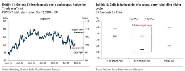 Na rozdíl od většiny mladých ekonomik jsou růst a inflace v Chile pozitivně ovlivněny ranou fází cyklu. Na rozdíl od ostatních zemí Latinské Ameriky postoj vlády k trhům omezuje nejistotu investorů. Obchod také představuje expozici na ceny mědi, u níž analytici z GS vidí růstový potenciál v tříměsíčním i 12měsíčním horizontu. Chilské peso navíc není tak závislé na čínské měně jako ostatní měny a zpomalení růstu v Číně již má v sobě započítáno. Tento obchod navíc poskytuje zajištění proti eskalaci obchodního napětí mezi USA a Čínou.