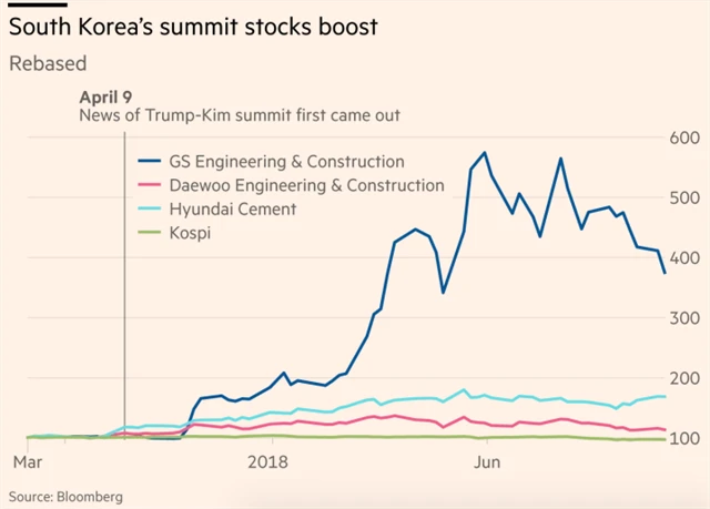Nejrozumnější proxy sázkou na to, že někdo v Pchjongjangu najde alespoň špetku zdravého rozumu, je přitom nákup jihokorejských aktiv. Soul a spol. již několik let nabízejí akciové fondy vycházející z premisy oteplení vztahů a následné unifikace poloostrova, které v závislosti na náladách hlavních aktérů strmě šplhají a dramaticky padají, přesto v součtu mezi roky 2014 a loňským prvním summitem Trump-Kim hlásily celkové zisky v řádech desítek procent, fond ze stáje Hi Asset Management patřící v této kategorii mezi premianty dokonce 60 %.