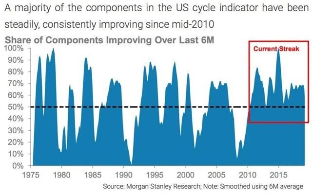 Aktuálně indikátor na první pohled říká, že je vše v pohodě. A právě to přimělo stratégy z americké banky vyhlížet zhoršení. Od dubna 2010 nenastalo období alespoň šesti měsíců, kdy by většina složek ukazatele naznačovala zhoršování podmínek. Tak dlouhé období bez výskytu takového varovného signálu je přitom nejdelší za dobu, kdy Morgan Stanley indikátor sestavuje a sleduje.