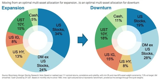 Konec růstové fáze cyklu je podle Morgan Stanley velice blízko (aktuálně během následujícího roku čekají pokles aktivity s pravděpodobností 70 %) a investoři by měli zaujmout ve svých portfoliích defenzivnější pozice. Nemusí hned přijít recese, výnosy na kreditním a akciovém trhu se ale podle stratégů banky výrazně zhorší.