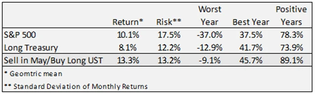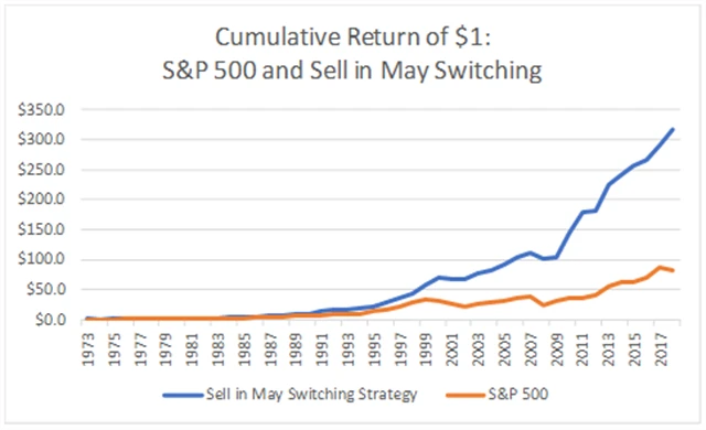 Zatímco držení akcií od roku 1973 vynáší ročně jen něco málo přes 10 % a držení dluhopisů něco málo přes 8 %, při přechodu od akcií k dluhopisům na konci dubna a od dluhopisů k akciím na konci října bylo možné dosáhnout průměrného ročního výnosu 13,3 %, a navíc při nižším riziku než v případě nepřetržitého držení akcií.