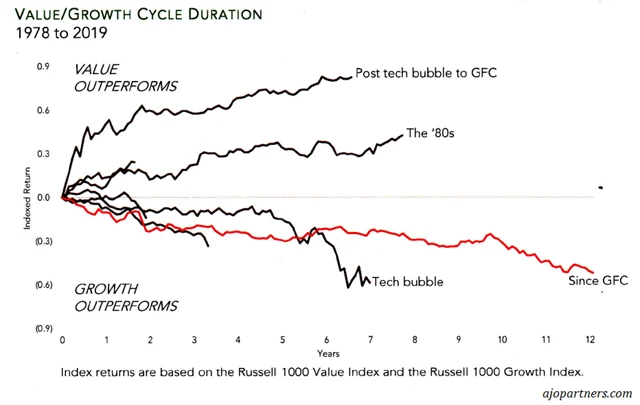 Podle údajů společnosti AJO Partners je současné období podvýkonnosti hodnotového přístupu nejdelší v historii. Nemusí trvat dlouho, aby bylo také nejhorší co do výkonnosti, když na tom bude hůře než období po prasknutí technologické bubliny.