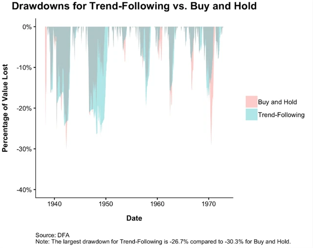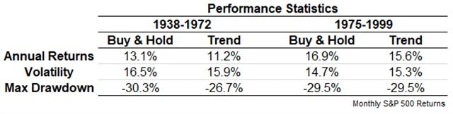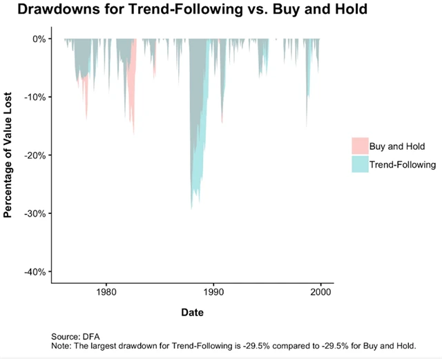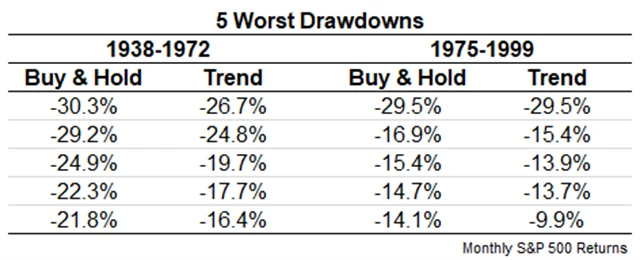 Strategie následování trendu přitom investory chrání právě při extrémních propadech. V obdobích bez silných medvědích trendů se její pozitivní vliv snižuje. V obdobích bez výrazných poklesů jsou výnosy strategie při stejné volatilitě horší než u přístupu "kup a drž".
